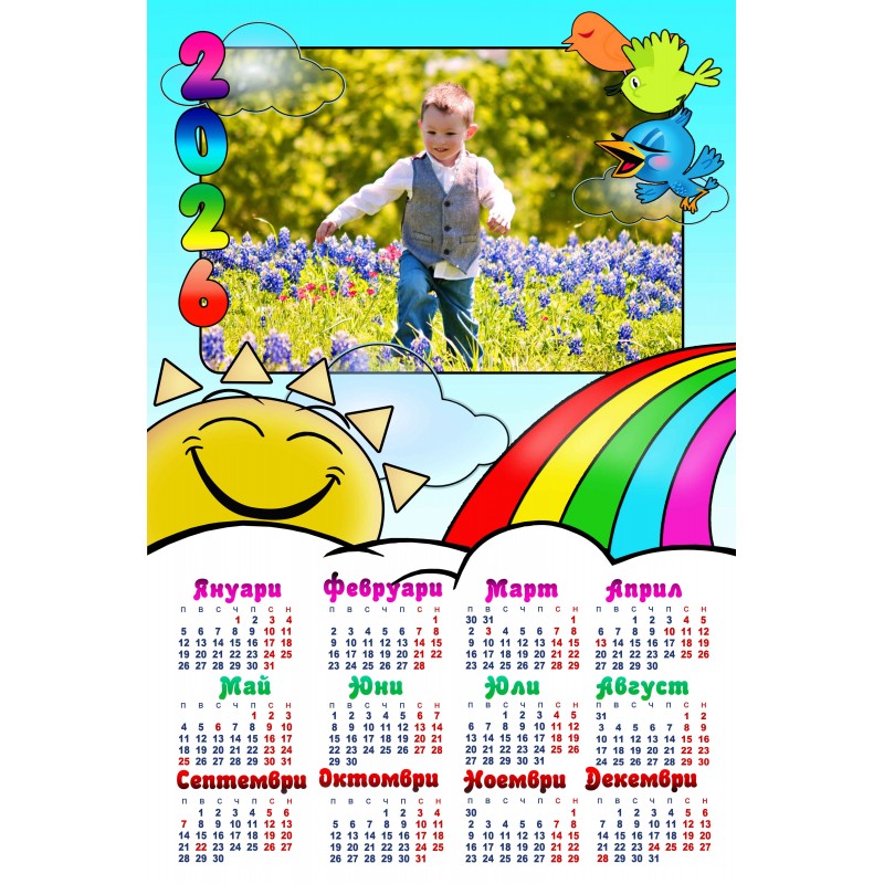 За своя еднолистен календар може да използвате готовите дизайни, в който трябва само да поставите вашата любима снимка. Календарите се изработват на фотохартия с формат 25х38 см.