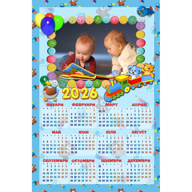 За своя еднолистен календар може да използвате готовите дизайни, в който трябва само да поставите вашата любима снимка. Календарите се изработват на фотохартия с формат 25х38 см.