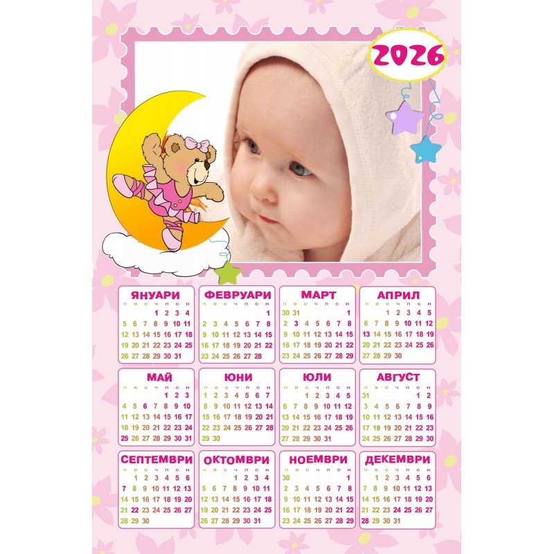 За своя еднолистен календар може да използвате готовите дизайни, в който трябва само да поставите вашата любима снимка. Календарите се изработват на фотохартия с формат 25х38 см.