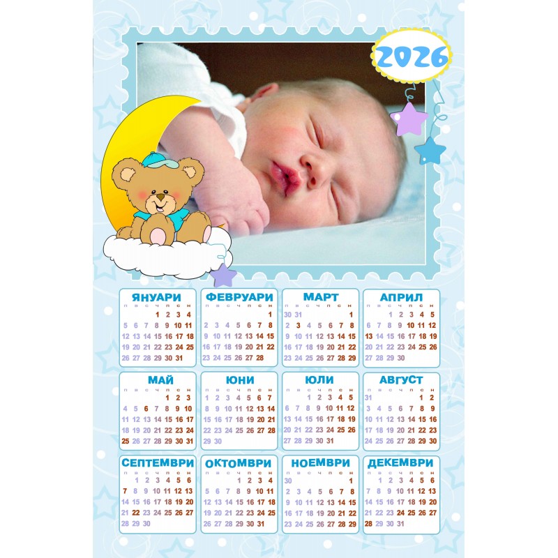 За своя еднолистен календар може да използвате готовите дизайни, в който трябва само да поставите вашата любима снимка. Календарите се изработват на фотохартия с формат 25х38 см.
