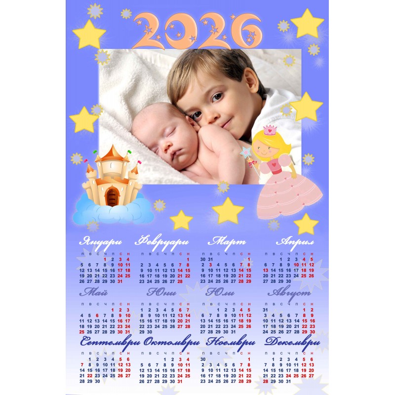 За своя еднолистен календар може да използвате готовите дизайни, в който трябва само да поставите вашата любима снимка. Календарите се изработват на фотохартия с формат 25х38 см.