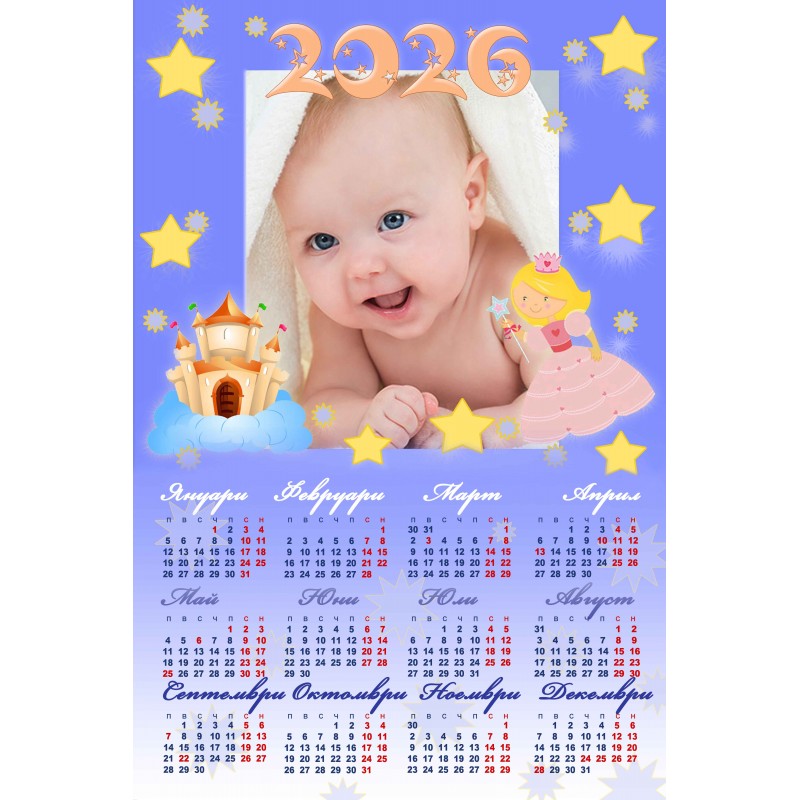 За своя еднолистен календар може да използвате готовите дизайни, в който трябва само да поставите вашата любима снимка. Календарите се изработват на фотохартия с формат 25х38 см.