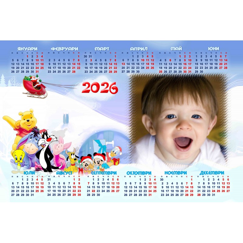 За своя еднолистен календар може да използвате готовите дизайни, в който трябва само да поставите вашата любима снимка. Календарите се изработват на фотохартия с формат 25х38 см.